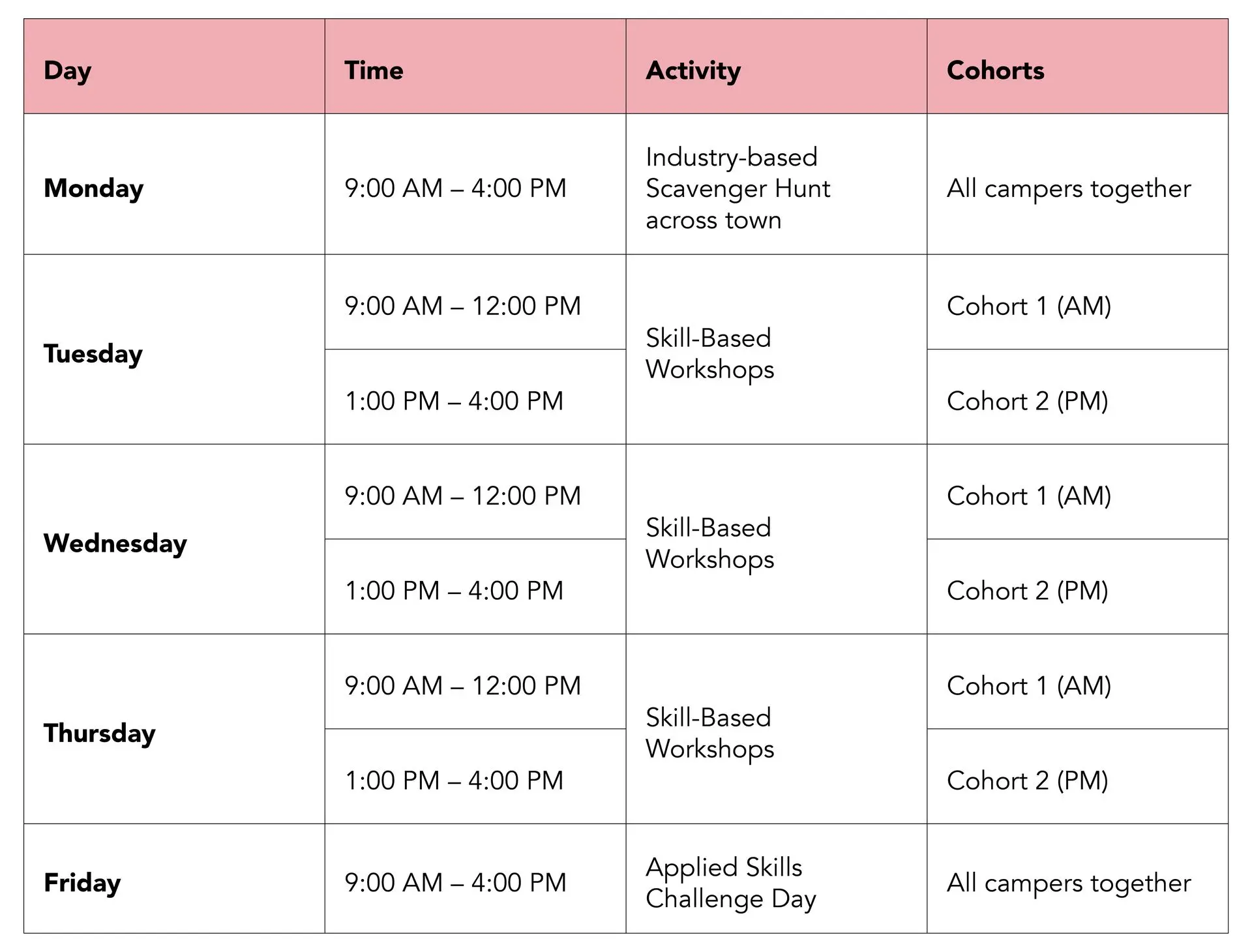 You’ll spend the week building core skills that matter for the future such as leadership, problem-solving, teamwork, and creativity while having fun and trying new things. Every challenge and project is designed to help you grow, make friends, and discover more about yourself.