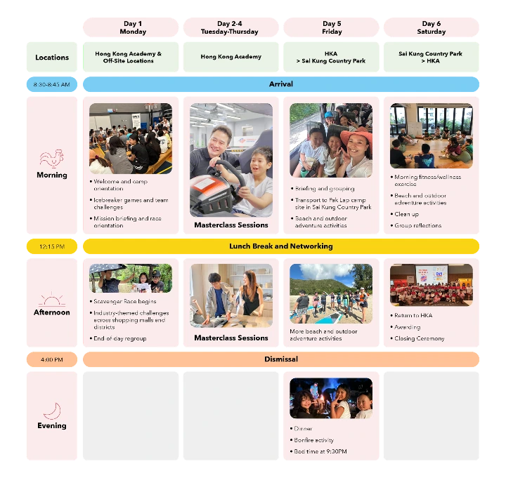 Each week follows the same six-day framework, but features different activities, industry experiences, and challenges throughout the program. This means students can join for one week or both weeks without repeating the same experience.
